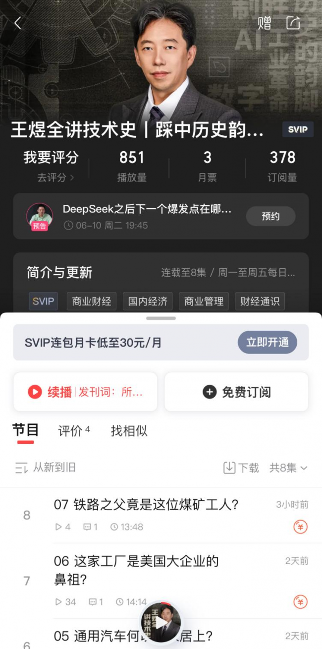 除《王煜全讲技术史》外,喜马拉雅还积累了众多商业科技财经类专辑。王煜全在喜马拉雅的另一档节目《科技要闻评论》,以"全球化视角洞察科技创新趋势"为特色,收获828万播放量,有2.9万用户订阅,持续追听。此外,平台还汇聚财经作家吴晓波《吴晓波频道》、创新工场董事长兼CEO李开复《AI未来进行式》等众多行业大咖作品。